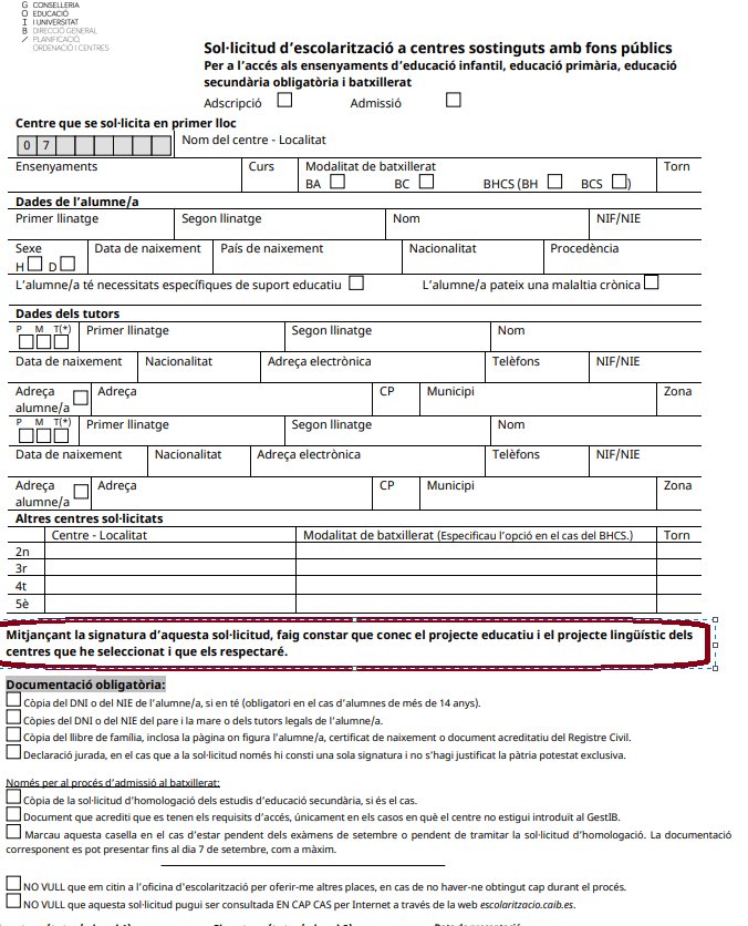 El artículo 18 de la Ley de Normalización Lingüística establece con toda claridad que los padres pueden elegir la lengua de primera enseñanza (catalán o castellano) y que los poderes públicos tienen la obligación de hacer efectivo este derecho. Sin embargo, la Conselleria obliga a los padres, en el impreso de solicitud de centro, a condicionar la elección y posterior adjudicación del centro al respeto del proyecto lingüístico del centro. Dado que todas las escuelas de Baleares tienen un proyecto lingüístico de inmersión lingüística en catalán, el resultado es que los padres no tienen más remedio que firmar que renuncian a su derecho de elegir lengua de primera enseñanza. "Se trata de un engaño en toda regla y de un abuso de poder de la propia conselleria, que con toda la intención decide no solo hacer caso omiso a la LNL sino ir contra ella de forma patente".